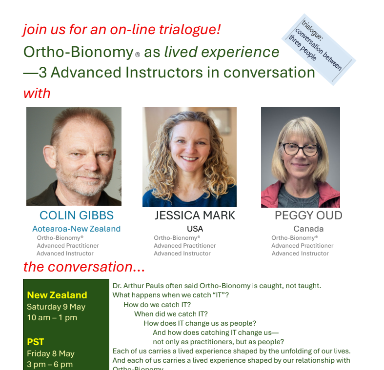 Three Advanced Ortho-Bionomy Instructors come together for a three-hour conversation, a trialogue, exploring Ortho-Bionomy as lived experience—reflecting on how life experiences may have predisposed them toward this work, and how Ortho-Bionomy has shaped them as their lives unfold.
